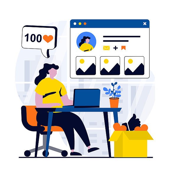 Social network concept with people scene in flat cartoon design. Woman edits her online profile using laptop, posting photos, sharing digital content online. Illustration visual story for web
